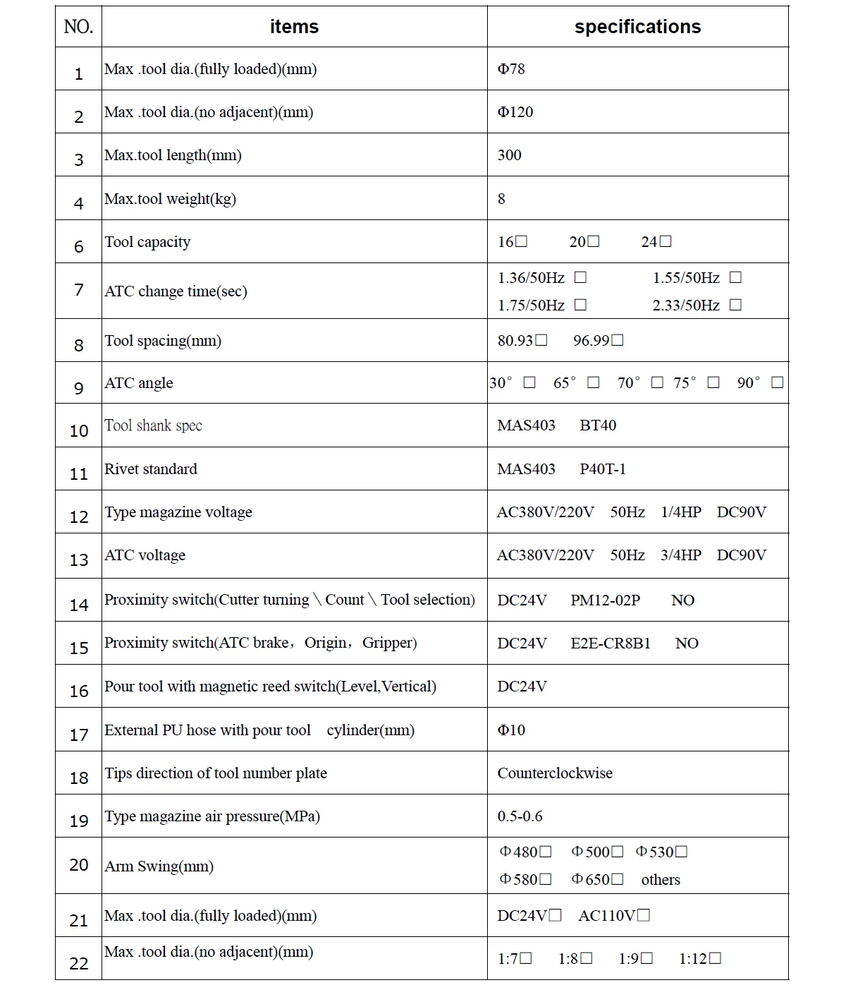 4. Before the tool is placed in the pocket, make sure the tool size, weight and length, and to ensure screws being screwed into the handle,still to ensure that the size from the shank end to rivet (A) meet the requirements of the machine.Shown in figure,for example:BT40 A=100.4±0.2mm,To ensure the normal broach,when the tool change.The concentricity of the position center in arm shank and spindle center should be within the φ0.02mm.