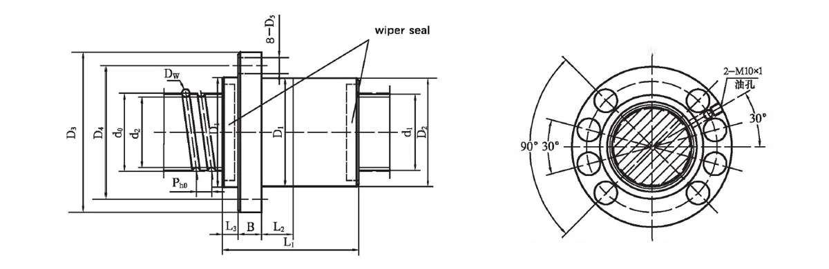 | Spec. | Nominal dia. d0 | Basic lead Ph0 | Outer dia. d1 | Ball dia. Dw | Bottomdia. d2 | Number of circles n | Basic rated load | Stiffness KC N/μm | |