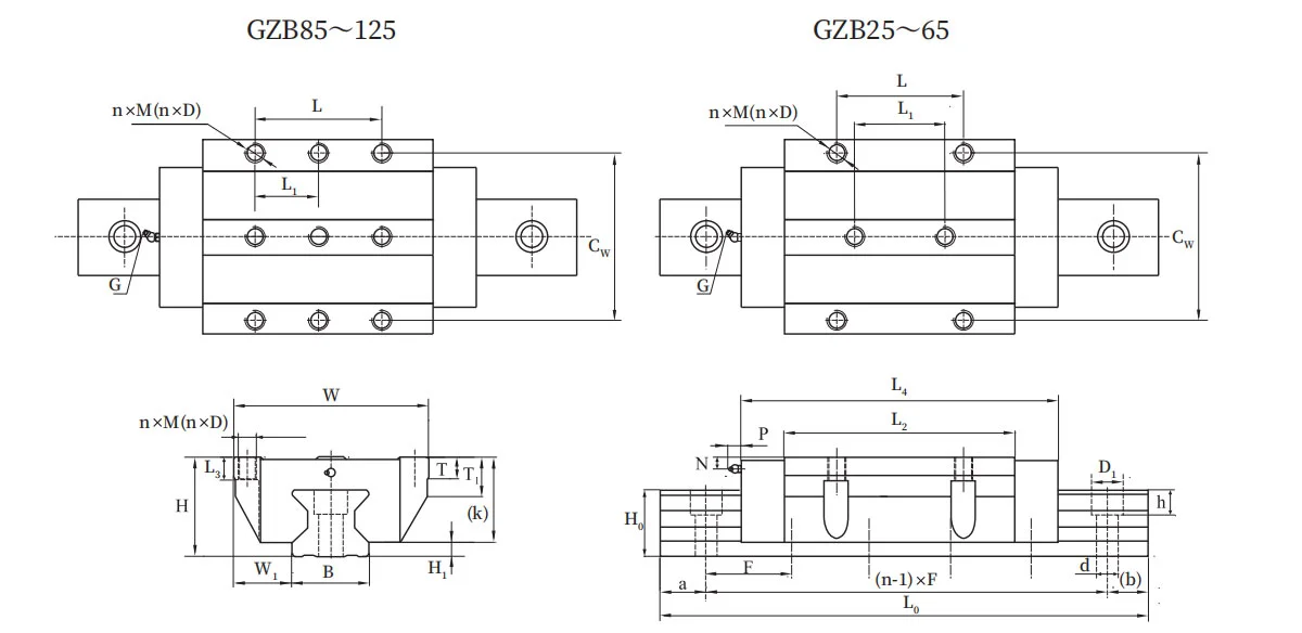 2).AA/AAL blocks of GZB series are flange type and top mounting holes are thread holes, up-lock see dimension M, down-lock see dimension D.